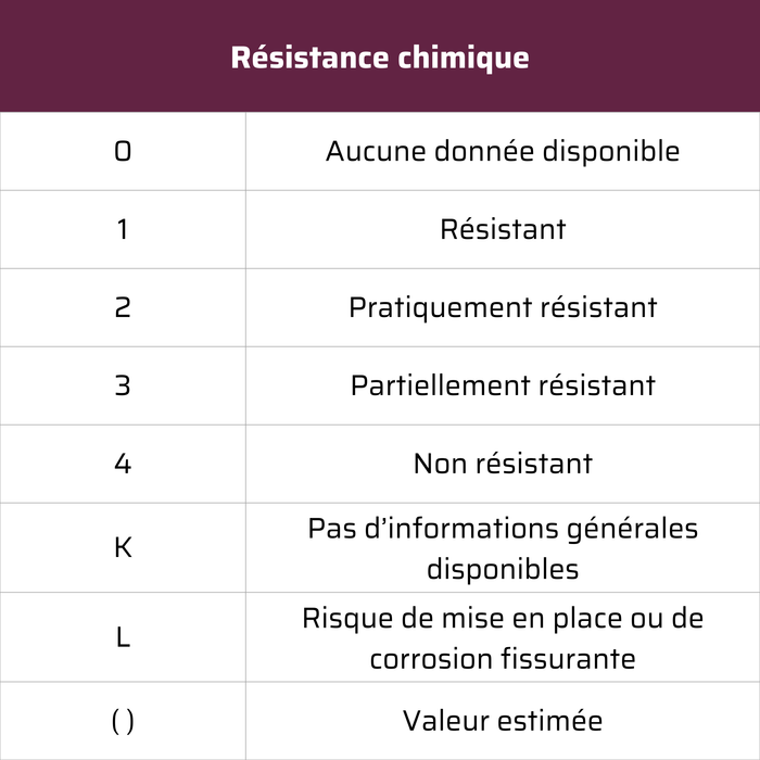 Pour toute application impliquant des produits corrosifs ou des environnements chimiques exigeants, il est fortement recommandé d’effectuer des essais indépendants, une vérification sur site et une validation technique complète.