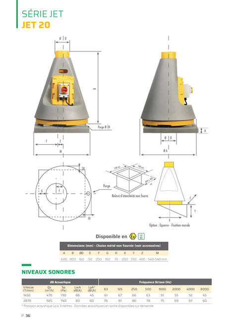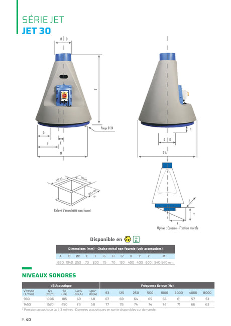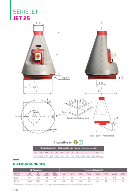 A rejet vertical, ce ventilateur est généralement monté en toiture ou sur un mur (montage vertical ou horizontal). Les extracteurs de la famille JET sont idéals pour les parcs aquatiques, les environnements marins et salés, les évacuations par hottes et bien plus encore.